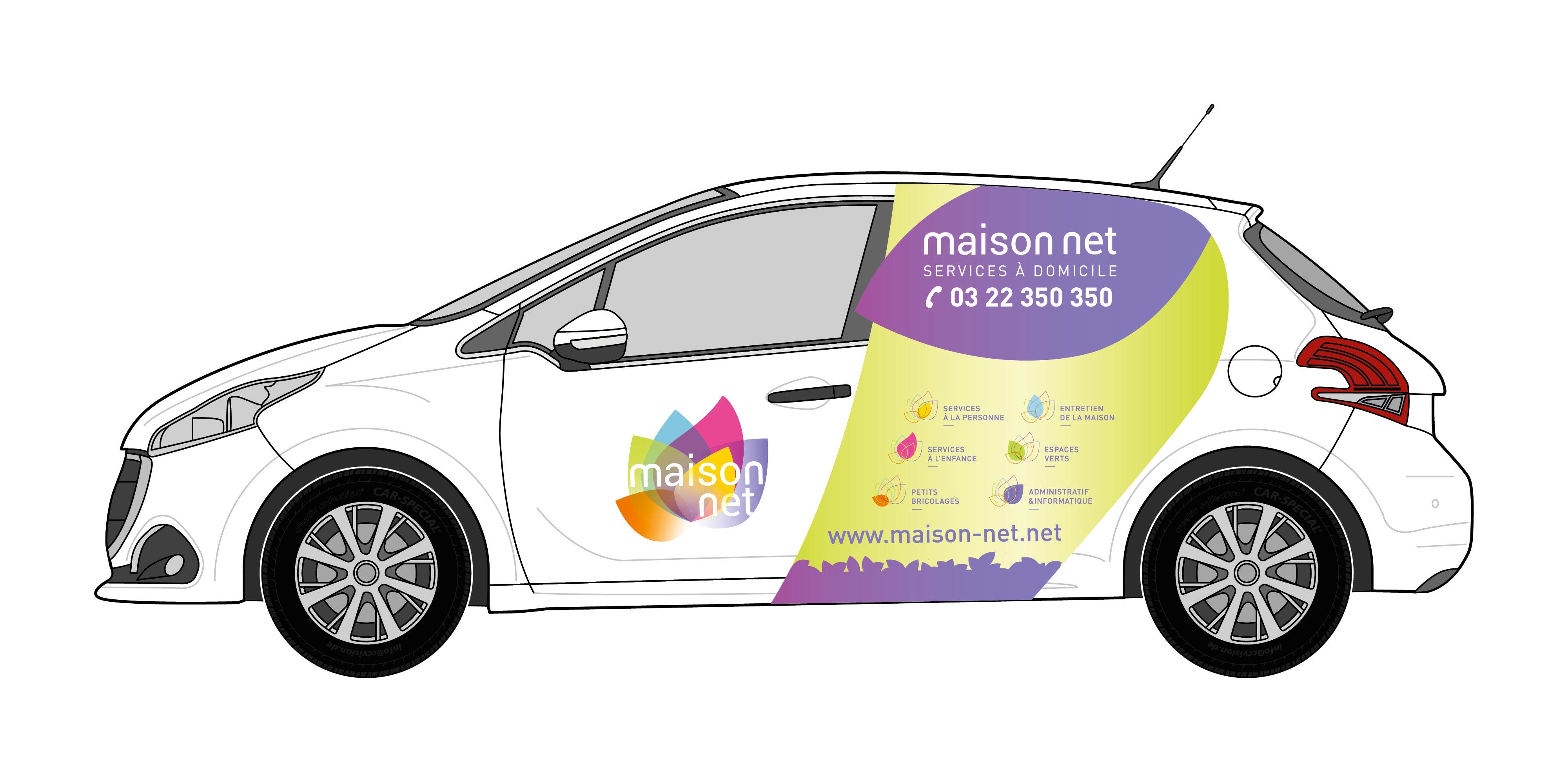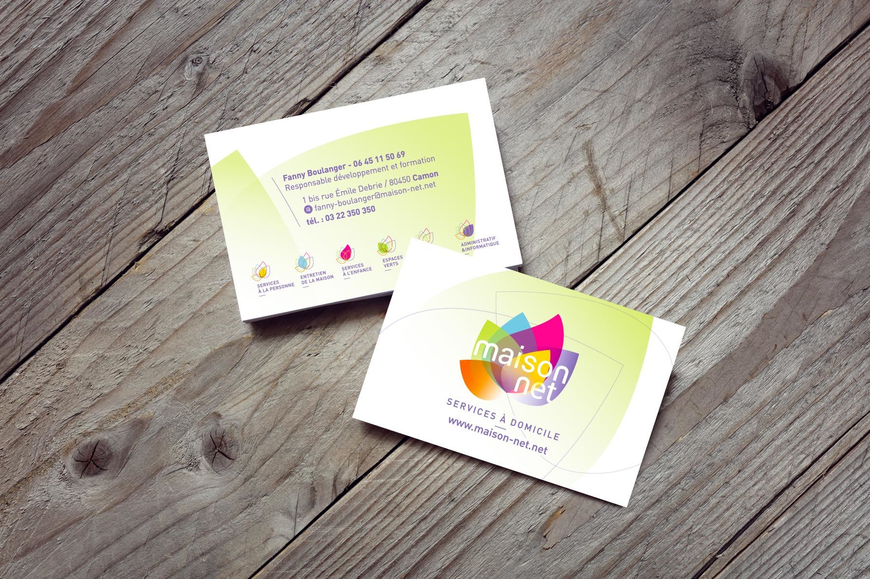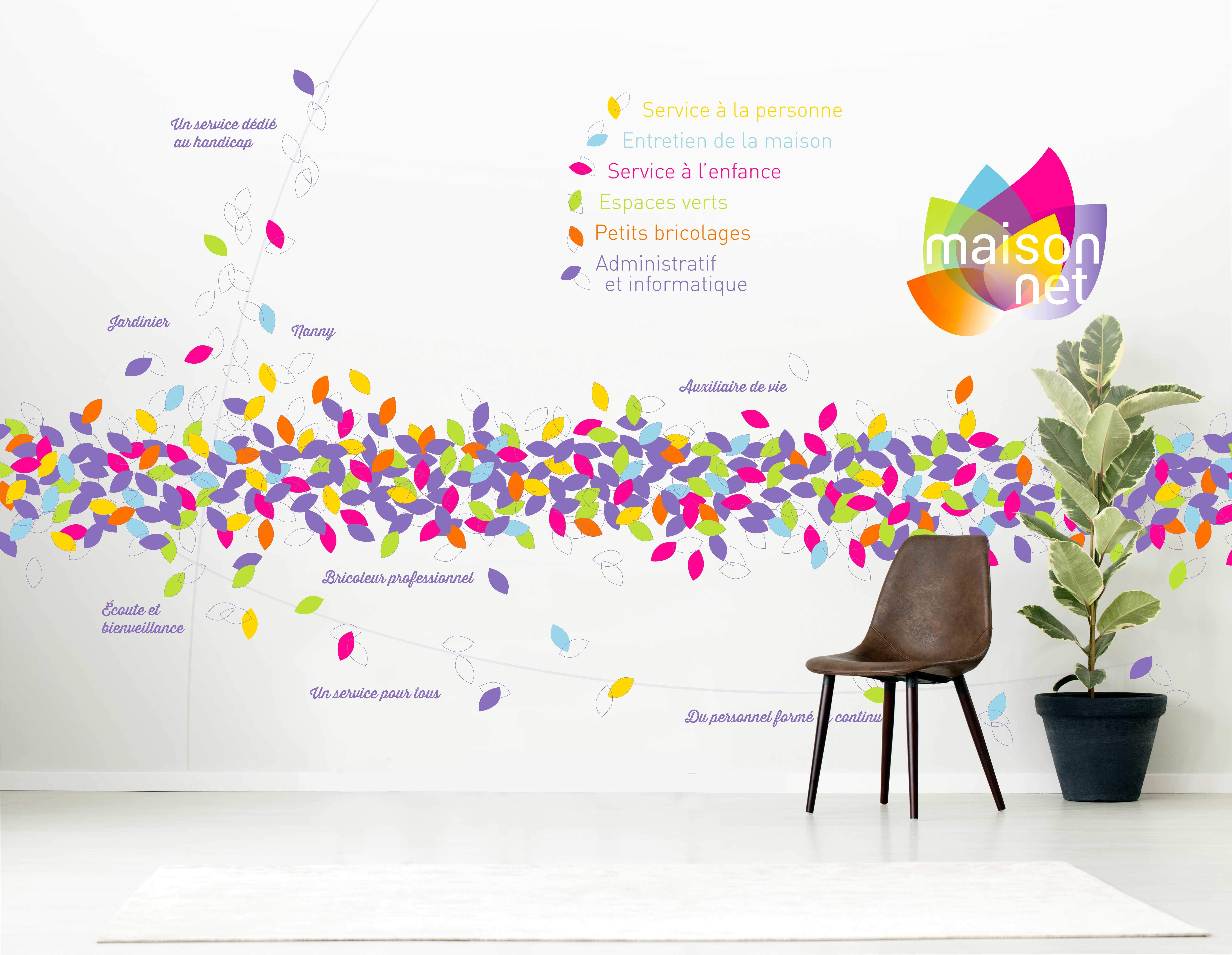 Nous avons donc créé une charte graphique généreuse, enthousiaste et colorée, avec un vocabulaire graphique déclinable selon les différents services et supports de communication : carte de visite, flyer, flocages véhicule et vitrine, sticker pour hall d’accueil dans une agence Maison Net….