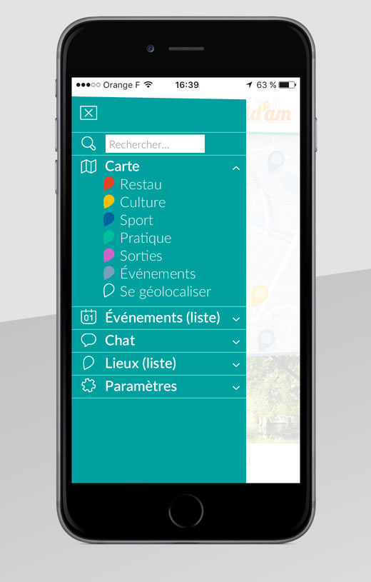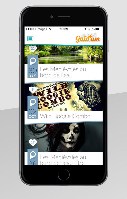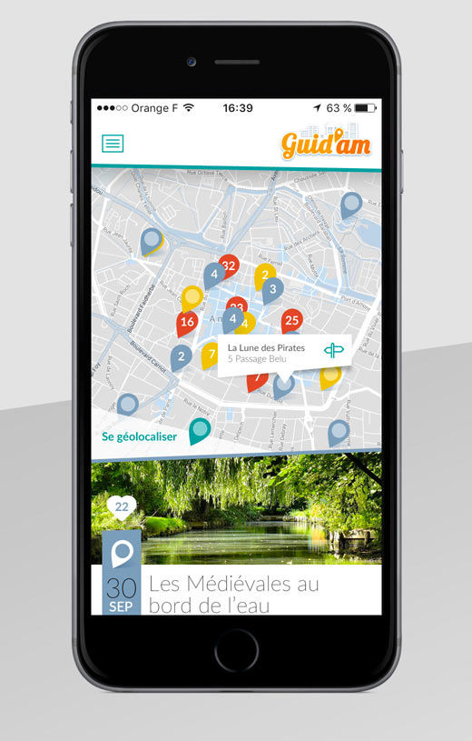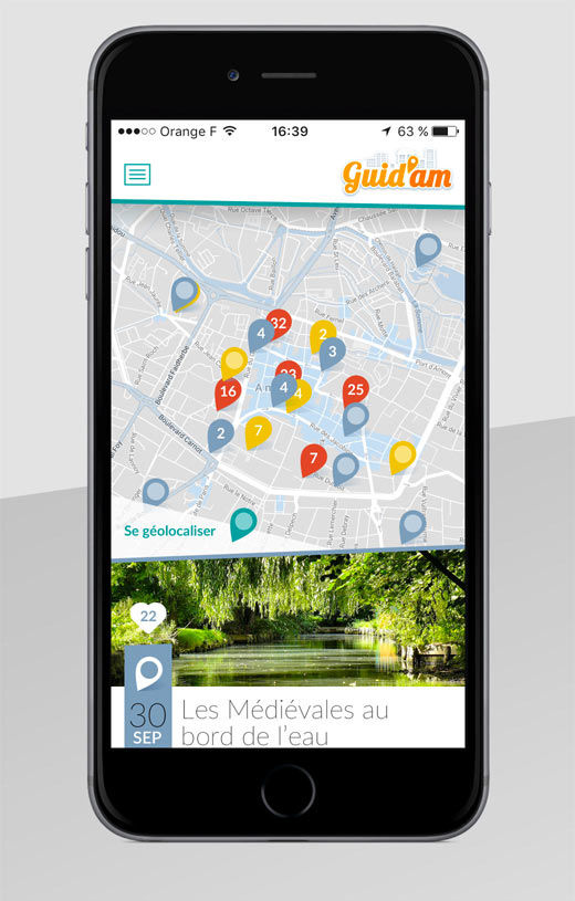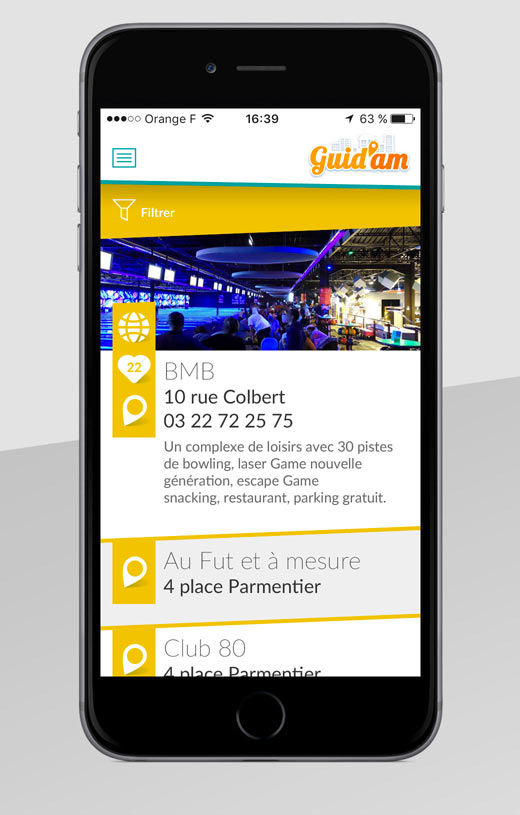 Création graphique de l’application Mobile des étudiants d’Amiens « Guid’Am ». Une sélection des meilleurs lieux de la métropole répartis en catégories (Restaurants, culture, …).